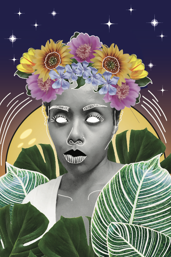 The flowers are my favorites from both the United States and Dominican Republic, which symbolizes both sides of my identity. I also added in monstera plant leaf because they are so beautiful to me. I began duplicating the images to help make the flower crown and foliage to give them a more full, lush feel. Mainly, I wanted it to look like I was standing in an trippy, ethereal forest :)